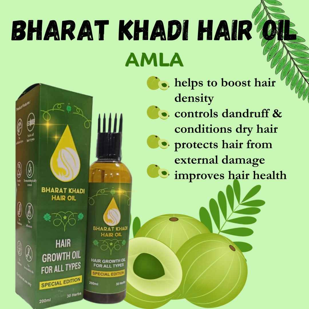 Hair oil by Bharat Khadi Hair Oil is powered with Cold pressed coconut oil, Bhringraj, Amala & clove increases blood circulation to the scalp and roots, which promotes hair growth.